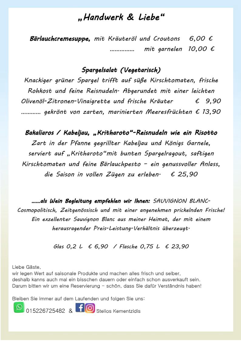 Nach unserer langjährigen Erfahrung und gastronomischen Liebe führen wir dazu eine Regionale und Saisonale Küche mit schnell wechselnder Speisekarte.